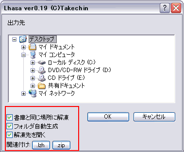 ●6 すぐに、「Lhasa」が起動して、左のようなウィンドウが開きます。 関連づけの、「lzh」、「zip」をクリックしてください。 これで、「lzh」、「zip」を解凍できるようになりました。「OK」をクリック。 後の設定(「書庫と同じ場所に解凍、フォルダの自動生成、解凍先を開く)などは、自分の使い勝手がいいように、設定してください。 なお、この設定は、いつでも「Lhasa」を起動すれば、変更することができます。 |