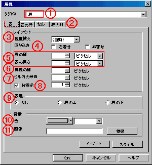 ●ホームページビルダーの場合 ●「表の挿入」ボタンをクリック。列の設定を、2列にします。 ↓ ●表の左側のセルを右クリックして、現れたメニューから、「属性の変更」を選択。 ↓ 「▼」ボタンを押して、メニューから「表」を選んでください。 ↓ 枠表示のチェックマークを、はずします。 ↓ 合わせて調節します。)「OK」を、クリック。 ↓ ●これで、右側のセルに、文章を打ち込めば、模様が隠れることは、ありません。 |