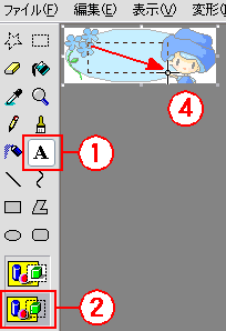 ●1.「ペイント」を起動して「ファイル」→「開く」で、文字入れしたい画像ファイルを、開きます。 このとき、「ファイルの種類」は、「すべてのピクチャファイル」にしてください。 ↓ ●2.ツールバーで、「テキスト」ボタン ↓ ●3.カラーボックスで、文字色を選択します。(※注1) ↓ ●4.ドラッグして、文字入力の範囲指定をします。 ↓ ●5.書式設定ダイアログが開くので、文字の大きさ、フォントを指定します。(ダイアログが開かないときは、メニューバーの「表示」→「書式バー」をクリックしてください。) ↓ |