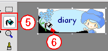 ●.影付き文字にするためには、最初に濃い色(影の色)で、文字を記入し、同じ手順で今度は薄い色の文字を記入します。 カーソルが矢印になったときに、ドラッグして1ピクセルずれた場所に移動させます。 ※ 左の例の場合、文字色は白で設定していますが、バナーの中に、白がないので、確定するとクリーム色になります。 |
