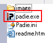 ●16「Padie」を解凍したフォルダ内の「Padie.exe」を、 ダブルクリックして、「Padie」を起動させます。 ↓ ●17.bmp形式で保存した●15の画像ファイルを開きます。 ↓ |