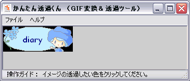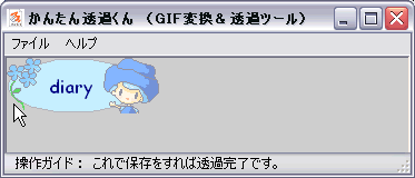 ●24.透過させたい色の部分を(ここでは、黒の部分)、クリックすると、透過された画像が表示されます。 ↓ ●25.「ファイル」→「名前を付けて保存」で、正式な名前を付けて保存してください。 これで、終了です。 |