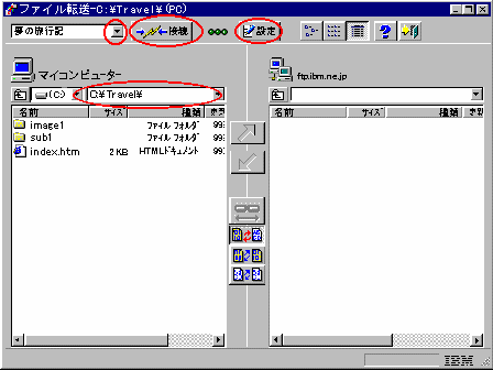 「ファイル転送」を起動したらまず、左上のボックスの「▼」ボタンをクリックして、上の@でつけた「サーバープロファイル名」を選択します。 ↓ 「マイコンピューター」で、サイトのフォルダを選択して、左図のように、表示させてください。 (例:「Trvel」フォルダ) ↓ |
