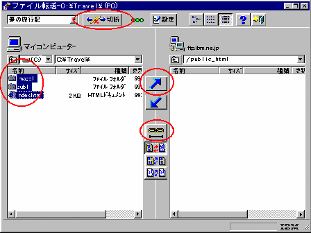 ファイルが、全部転送されたか、確認して、「切断」ボタン (注意:「切断」ボタンをクリックしても、ダイヤルアップ接続は、切断されていません。) ↓ Webブラウザから、あなたのHPに接続して、実際にちゃんとアップロードされているか、確認しましょう。 |