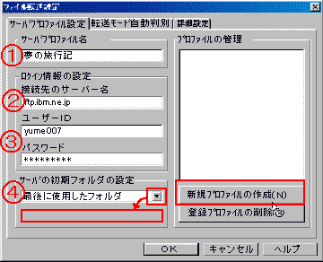 ◆ホームページビルダーのメニューバーの「ツール」より、「FTPツールの起動」を選択(または、プログラムより、「ファイル転送」を起動)。「ファイル転送」を、起動させます。 ↓ ◆「設定」ボタン ↓ ◆「新規プロファイルの作成」ボタンをクリック 好きな名前を入力してください。 ここでは、HPのタイトルを、入れておきます。 |